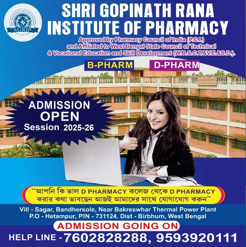 ADMISSION GOING ON SHRI GOPINATH RANA INSTITUTE OF PHARMACY ( D PHARMACY ,B PHARMACY) - DUBRAJPUR(2025-2026)